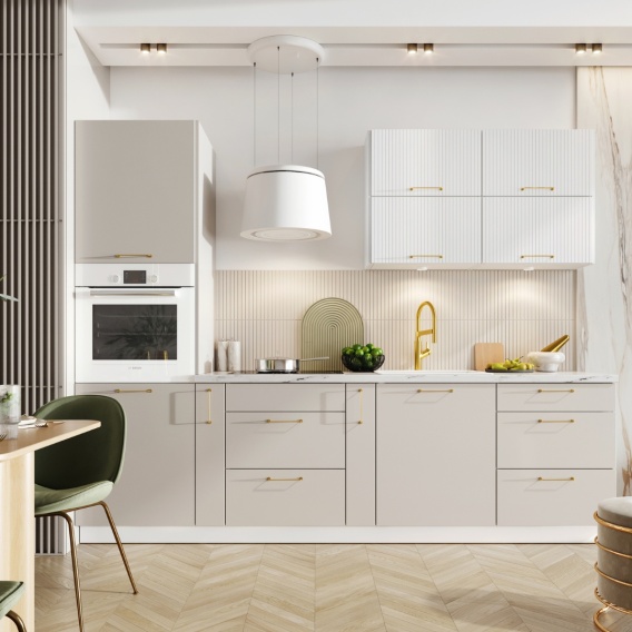 Kate to inspirowana stylistyką retro kuchnia o subtelnie ryflowanych frontach, wykonanych z foliowanej płyty MDF o grubości 16mm. Fronty dostępne są w stonowanej, matowej kolorystyce. To propozycja dla tych, którzy pragną połączyć wyrafinowaną estetykę retro z funkcjonalnością i nowoczesnym stylem.