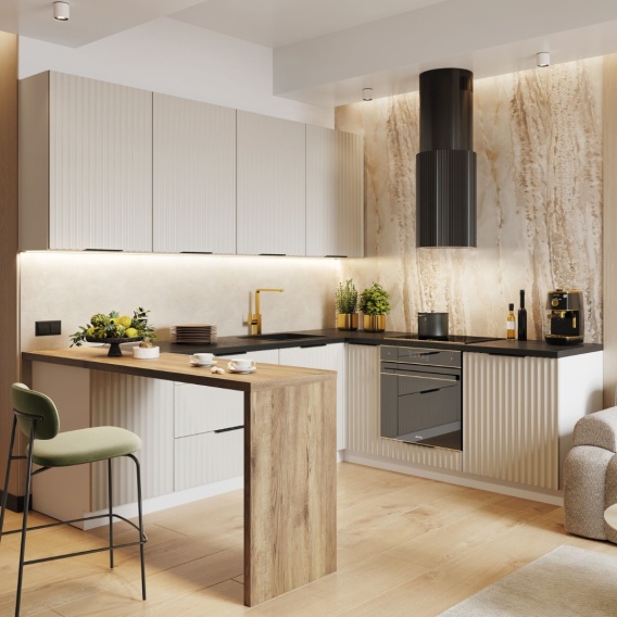 Tracy to kuchnia zainspirowana stylem retro, która charakteryzuje się matowymi, ryflowanymi frontami wykonanymi z foliowanej płyty MDF o grubości 16 mm. Piękne frezy stanowią interesujący element dekoracyjny, który nadaje oryginalności jednokolorowym powierzchniom.